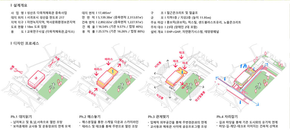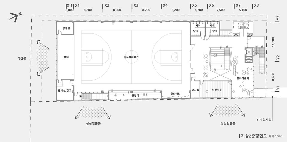 체육활동과 식음이라는 기본적인 기능 이외에, 여러 세대 및 다양한 사람들이 어울리고 쉬어갈 수 있는 열린공간의 성격으로, 가변적 공간 구성과 운영이 가능한 구조로 계획하였다.